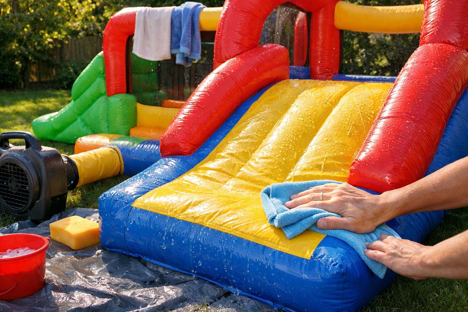 După o zi cu apă, eu fac mereu un pas în plus: opresc apa cu suficient timp înainte de a încheia joaca, ca să aibă timp să se scurgă și să se evapore o parte. Îi las pe copii să mai alunece puțin, fără apă, și asta ajută, pentru că mișcarea lor împinge apa din pliuri, o aduce la suprafață. Apoi, când se liniștește totul, șterg zonele unde se adună bălți și îl las umflat la uscat, cu un pic de vânt.